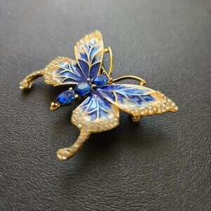 Beautiful blue enamel butterfly brooch with sparkling rhinestone accents and rich gold-tone metalwork. The wings are hand-painted in shades of deep sapphire and ivory with elegant veining, highlighted by three faceted blue crystals down the center.