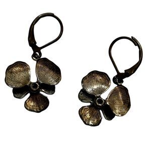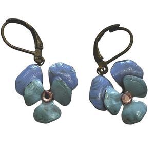 Add a touch of vintage charm to your look with these pretty blue enameled flower dangle earrings. Sweet and simple, they feature delicate blue petals, a sparkly pink rhinestone center, and an antique gold-tone lever-back clasp for secure wear.