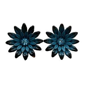 Vintage light and dark blue enamel flower earrings with a rhinestone center. Lightweight, clip-on style with a floral, petal pattern and a smooth finish. The earrings measure .75" round.