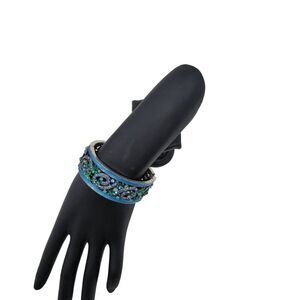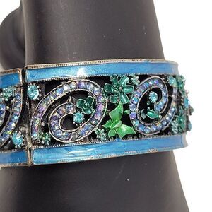 Blue Enamel Rhinestone Filagree Clamper Bangle Bracelet Flower Sparkle Glam 6.5"