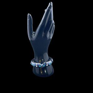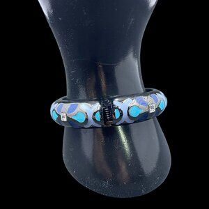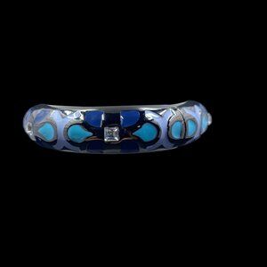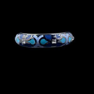 Add a touch of bold sophistication with this blue enamel geometric clamp bracelet, featuring a polished silver-tone base with turquoise, periwinkle, and navy enamel inlays accented by sparkling rhinestones. The hinge (clamp) closure ensures an easy, secure fit while maintaining a sleek silhouette.