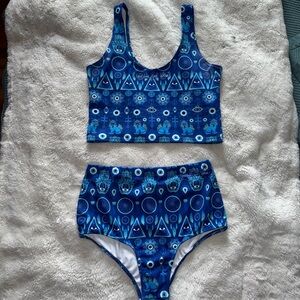 Stylish blue bikini set with unique patterns. Features a crop top and high-waisted bottoms.