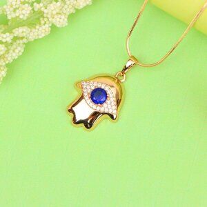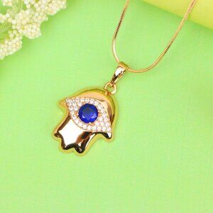 Stunning Hamsa hand pendant featuring a striking blue evil eye design. Crafted from gold-plated high quality brass for a polished, meaningful accessory.