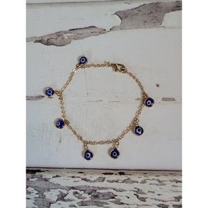 Blue Evil Eye Yellow Gold Tone Double Sided Glass Dangle Charm Dainty Bracelet