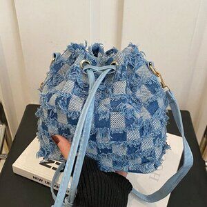 Blue Fashionable Women's Checkered Diamond-Shaped Shoulder Bucket Bag