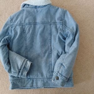 Stylish blue faux denim jacket for kids by Betsey Johnson. Features playful embroidered details and sequined hearts for a fun look. Sherpa lined, button up . Girl's size 7/8.