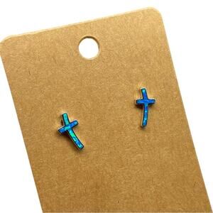 Beautiful! Blue fire opal cross shaped pierced style earrings. They measure 11.8mm. Solid sterling silver and stamped 925.