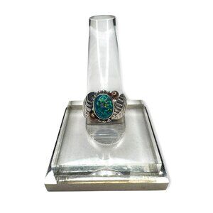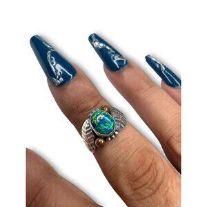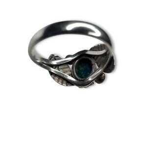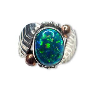Blue Fire Opal Sterling Silver Ring Oval Bezel Leaf Design Size 7