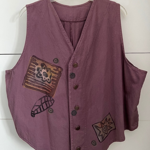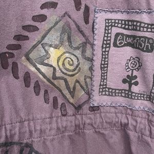 Stunning Invention Vest from my favorite Blue Fish catalogue, Summer 1995. Lightweight denim in size 3 (one size fits all). Color is Heliotrope. Gorgeous prints all around and excellent condition for this vintage piece. Very minimal fading. Classic 1995 patch on the back, and tie as you wish! Approx measurements: bust 51", front length 26"