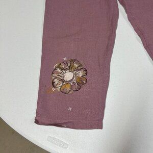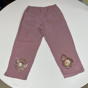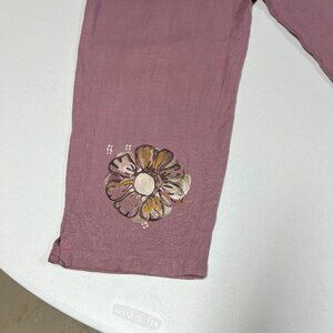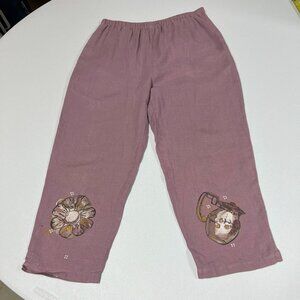 This 100% linen pants is the same color as the dusty rose vest in a former listing. However, they have different prints on them so we didn't list them as a set. But, many customers partner them as a set - it's your choice. Elastic must be replaced but if you have to shorten it, this is the place to do it. It has 2 side pockets.