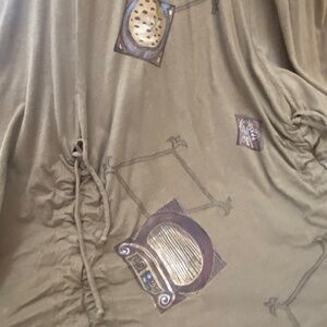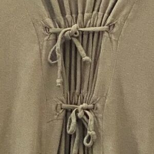 From Blue Fish 1998 Holiday Resort collection, the color, Glazed Tile, is a light olive green. It has long sleeves (dropped shoulders), a shawl collar, button front, integrated ties to vary the fit and length, and two very deep side seam pockets. The fabric is 100% organic cotton jersey - a mid-weight knit. This was marketed as a transitional coat, can be worn as a dress or layered, lagenlook style. It's in beautiful condition with no marks, holes, tears, or other signs of wear.