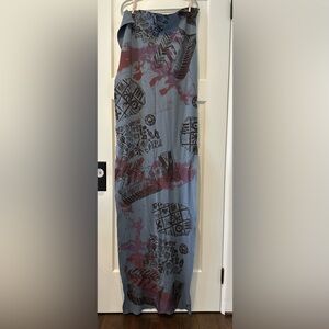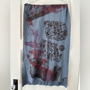 Organic cotton jersey scarf in a soft grey/purple. Printed on one side. Measurements are 20” x 70”.