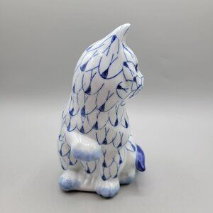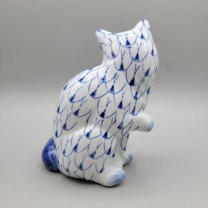Blue Fishnet Porcelain Cat Figurine Hand-Painted Statuette