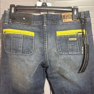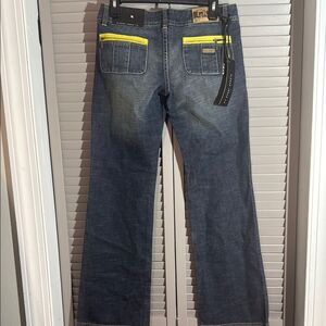These blue jeans feature a stylish flare and wide leg design, perfect for adding a touch of retro flair to your wardrobe. The medium wash denim offers a classic look, while the full-length cut ensures a flattering fit. With subtle fading and whiskering, these jeans provide a trendy, worn-in appearance.