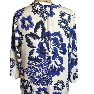This blouse features a vibrant blue and white floral pattern with large stylized flowers. The 3/4 sleeves and relaxed fit make it perfect for casual occasions, while the V-neck adds a feminine touch. The bold colors create a fresh and breezy look ideal for summer wear.