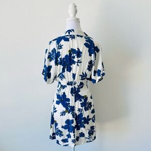 White button-front mini dress with a bold blue floral print and soft collar. Feels like something you’d see in a 90s rom-com. Easy, flattering fit that pairs with sneakers or a denim jacket for a casual vintage look.
