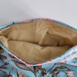 This versatile pouch can be used for just about anything- keeping your bag organized, storing cosmetics, accessories, make up, etc. Sky-blue corduroy fabric has a pretty floral pattern on both sides. Zip closure. Lined. Measures 7x10. Medium-sized perfect for daily use or a weekend getaway. This item is new without tags.