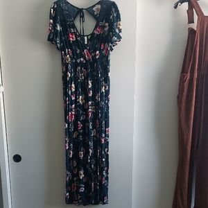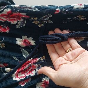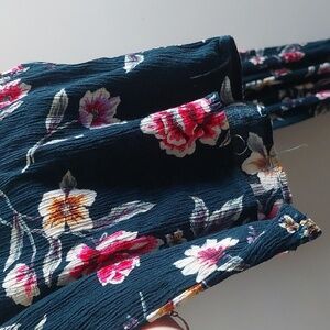 Lovely condition. Soft Stretchy and has pockets. Back Tie closure. Crochet shoulders. Wide legs. Rayon