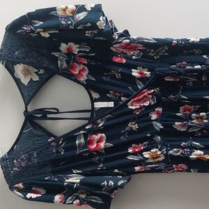 Blue Floral Flutter Sleeve Crochet Romper Jumper Faux Wrap Back Tie L Bohemian