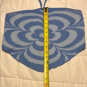 Chic blue knit halter top with a striking retro-inspired floral pattern. The top has a tie-string halter neck and a pointed hem. Perfect for a casual outings, music festivals, or dressed up for a night out!