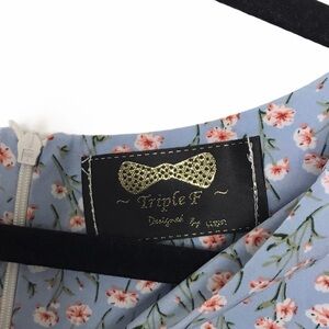 Sky blue dress with dainty floral print allover. Has short flutter sleeves, button decorations on front, back zipper closure and straps ties to cinch waist. Preowned. Some seams on ties are loose but otherwise in good shape. Missing size and material tag. based on measurements i'm listing it as a small . See measurements below. Brand: Triple F