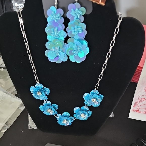 Elegant blue floral necklace and earring set, perfect for adding a pop of color to any outfit.