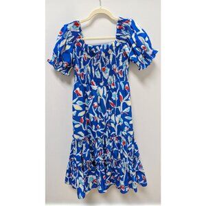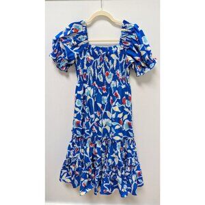 Blue Floral Off-The-Shoulder Maxi Dress. Size Large. Very gently used, with minor staining to the inner lining. It features off-the-shoulder sleeves, a maxi length, tiered ruffles, and a ruched/elastic style to the bodice and waist.