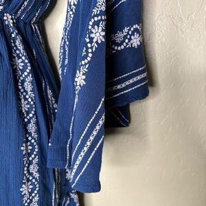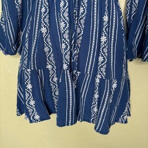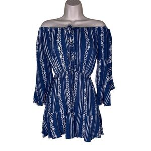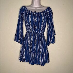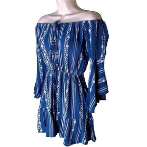 Blue Floral Print Off the Shoulders Bell Sleeve Boho Mini Dress Size S