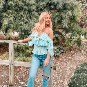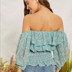 Drapey blouse featuring a floral print and an elastic waist. Off the shoulders.