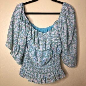 Blue Floral Print Off the Shoulders Boho Draped Sleeve Blouse Top Size Small S