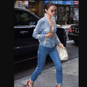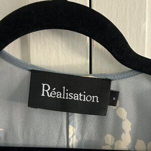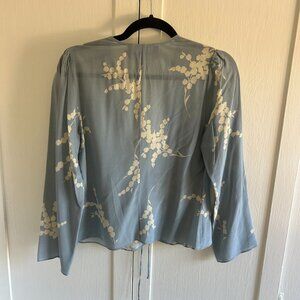 Gorgeous, sexy silk "Bianca" top by Réalisation Par in a pale blue floral print worn by Selena Gomez. Ties at front or has a slit on the side to tie at waist. In fantastic used condition- no rips or stains. Size S