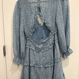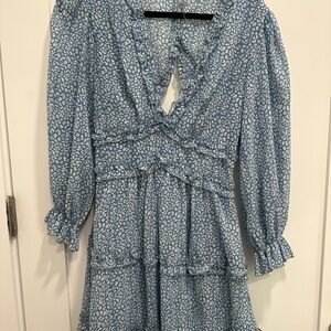 Chic blue dress with floral pattern and ruffle details. Perfect for any occasion.