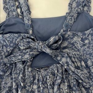 Lightweight blue floral tank top with ruffled shoulder straps. Soft, flowy fabric provides comfortable all-day wear. Feminine scoop neckline and gathered waist create a flattering silhouette. Easy to style for casual looks and warm-weather outings.