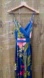 Romantic and a total dream come true! Luxurious satin, in a blue, blush pink, yellow, and green floral print, falls from adjustable spaghetti straps (that crisscross at back) into a princess-seamed surplice bodice and low back detail. High, fitted waist, with tying sash, tops a full maxi skirt with front slit. Hidden back zipper. Interior tag is cut. Floral patterns may vary from dress to dress.