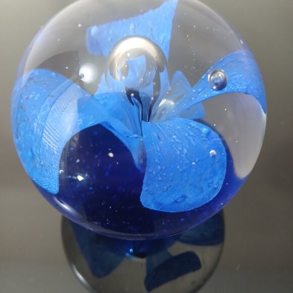 This resembles a blue flower. It's 2 inches tall and less than a pound in weight. It's a blue lovers paperweight