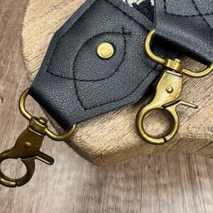 Adjusts to about 47 inches and it’s 2 inches wide. The hardware is antique gold color and this has a lobster claw clasp and brown vegan leather accents.