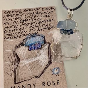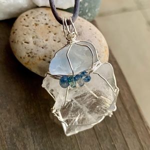 Calming powerful beauty! Vibrant blue Fluorite seems to activate the Faden Quartz - I feel cool, soothing protective energy in my hand when I hold this pendant! It is believed that the Faden can ignite & connect our physical, mental, emotional & spiritual bodies to commune with our great Earth Mother! Chakras 6 & 7 - third eye and crown. Wrapped in Sterling by me, on a long gray cord, gift boxed with signature artwork and crystal notes. Artisan, one of a kind. Spiritual amulet, New Mexico Fluorite, Faden pendant, rational energy, align, chakras, Santa Fe, Sundance, Mother Earth, less stress, calming, silver light, boho, hippie, contemporary, crystal jewelry, crystal necklace