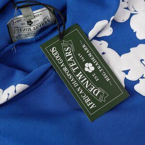 Details: Blue base color, one double-strap pocket on the front, 100% cotton, pure white, high-embossed clustered floral pattern