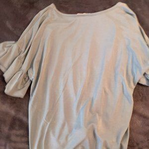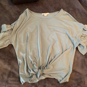 Blue top, loose sleeves, adjustable knot. FITS MEDIUM AND SMALL