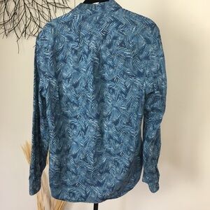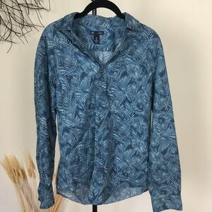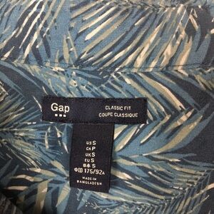 Blue leaves GAP button down in a size small. Flat lay measurements Pit to pit 21 Length 27 Material 100 percent cotton