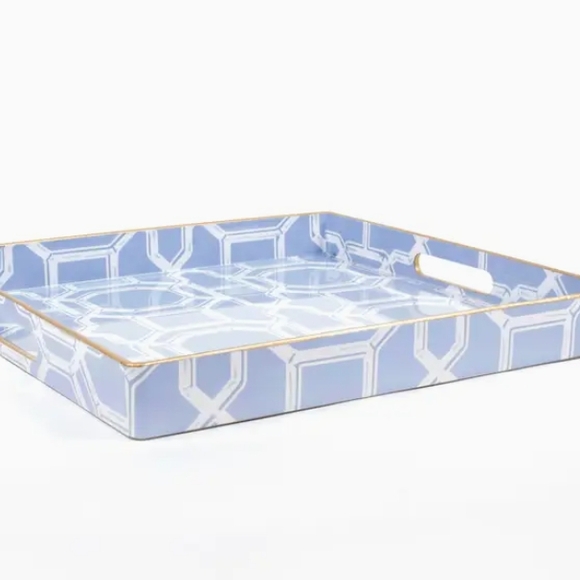 Stylish blue tray with a geometric pattern. Features a gold accent trim. Perfect for serving or decor.