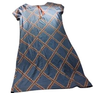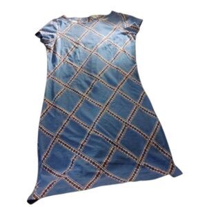 Stylish blue dress with a geometric pattern. Perfect for casual outings.