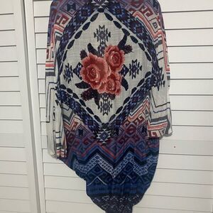 Stylish kimono with a vibrant blue geometric pattern. Perfect for layering.