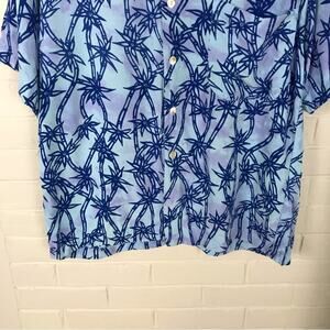Good pre worn condition. Hawaiian shirt by blue ginger. Great for a beach destination, vacation, trip, cruise, pool, beach etc. Love the fun vibrant blue print. Buttons have a pearly shell look to them. All sales final.