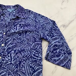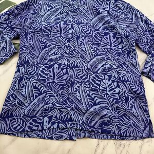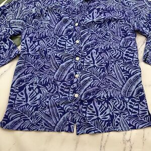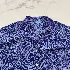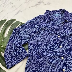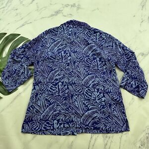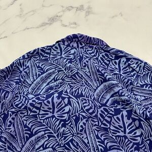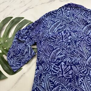 Blue Ginger women's purple and blue tropical leaf print button up top, size S. It is free from any rips or stains. It measures about 42 inches around the bust and is about 26 inches long.