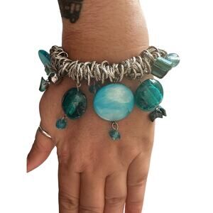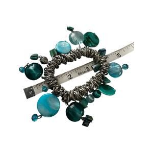 Channel ocean vibes with this vintage beaded stretch bracelet. It has hundreds of silver links with glass beads in shades of blue green, mixed with dyed shell natural beads as well. It feels fresh and bright and natural. I have a 7" wrist and it is shown on me and it went on and off pretty easily with plenty of stretch. The only flaw is that some of the silver links have sharp edges and may need to be clamped down a bit. It's bright, eye-catching and perfect for Spring/Summer.