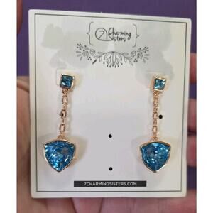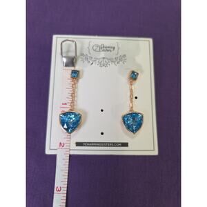These dangle earrings feature vibrant blue glass rhinestone crystals set in faint rose gold tone sterling silver. The earrings have a small square crystal at the top and a slightly rounded triangular shaped crystal dangling underneath. They have faceted cuts, giving them a sparkling and glamorous look. The closure is in the form of butterfly backs on posts for pierced ears. The earrings are 1-5/8" in length and are perfect for adding a touch of beauty and fashion to any outfit. These are new on the original card. I did test the metal to make sure it is sterling silver since it is marked 925 (see last picture for acid test).