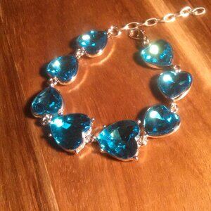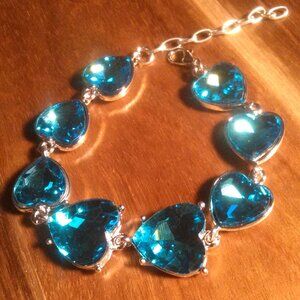This sparkly piece features aqua color blue glass in a heart shape design. The bracelet in a metal alloy set in silvertone and has an adjustable length of 7.5 to 9.5 inches. Brand new.