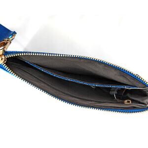 Add some shimmer to your outfit with this stunning blue glitter wristlet! Perfect for a night out, holiday parties, or when you just want to travel light in style. The bag features a metallic blue finish with fine sparkles all over.