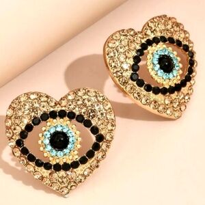 Blue and Gold Pave Heart Evil Eye Rhinestone Earrings CZ Crystal Cutout Hearts